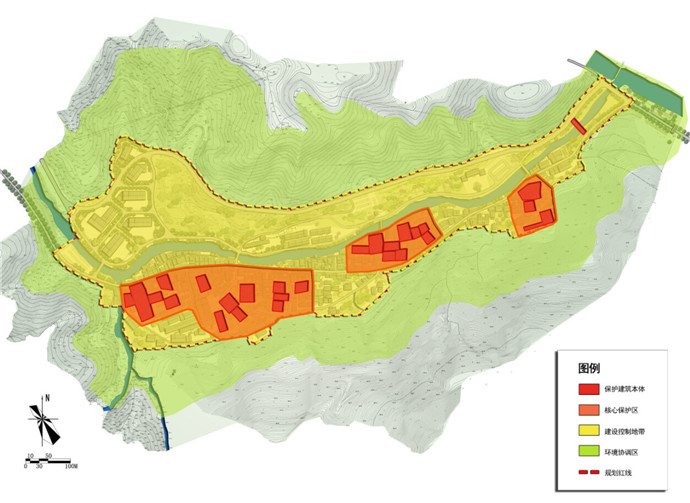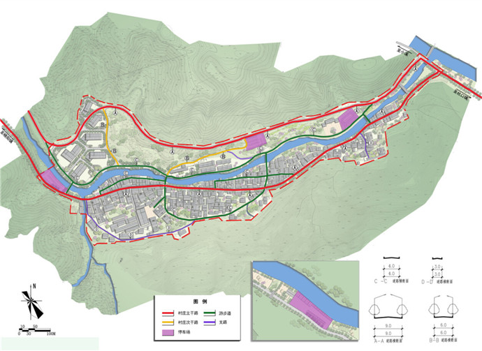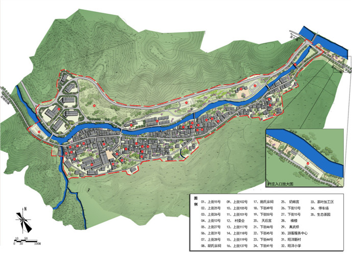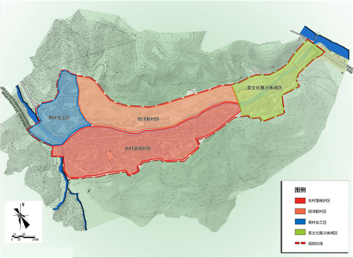 本次规划依托坦洋村“坦洋工夫茶”这一省级非文化物质遗产,尊重闽东现存山地聚落布局形式,挖掘坦洋当地风火墙、悬鱼、门楼、窗花、梁枋等建筑细部,通过“修旧如旧”的保护手法,激化原有业态,通过保护与发展同步的思路,形成“两轴三心三带四片区”的规划格局,采用“保护、修整、更新、废弃、修复”等多种保护手法,重点打造“南部的古村落保护片区、东部茶文化展示休闲区、西部的茶叶加工区及中北部坦洋新区片区”,再现明清时期茶马古道“坦洋工夫”的传奇神话。