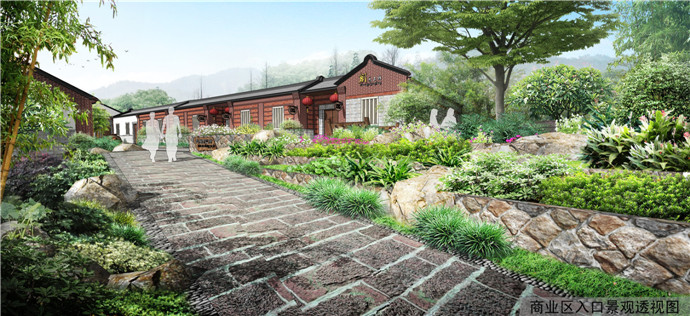 新村设计根据项目特征将项目用地分为“餐饮区、民俗商业街区、民宿区、文创工坊”四大分区,并根据由外而内、由动至静、由实与虚之空间变化依次排布各大功能分区,充分利用地形特点在高低错落的场地空间中将不同功能分区内的人流进行有效的划分,同时又设计台阶将不同区域的人流进行交叉联系。